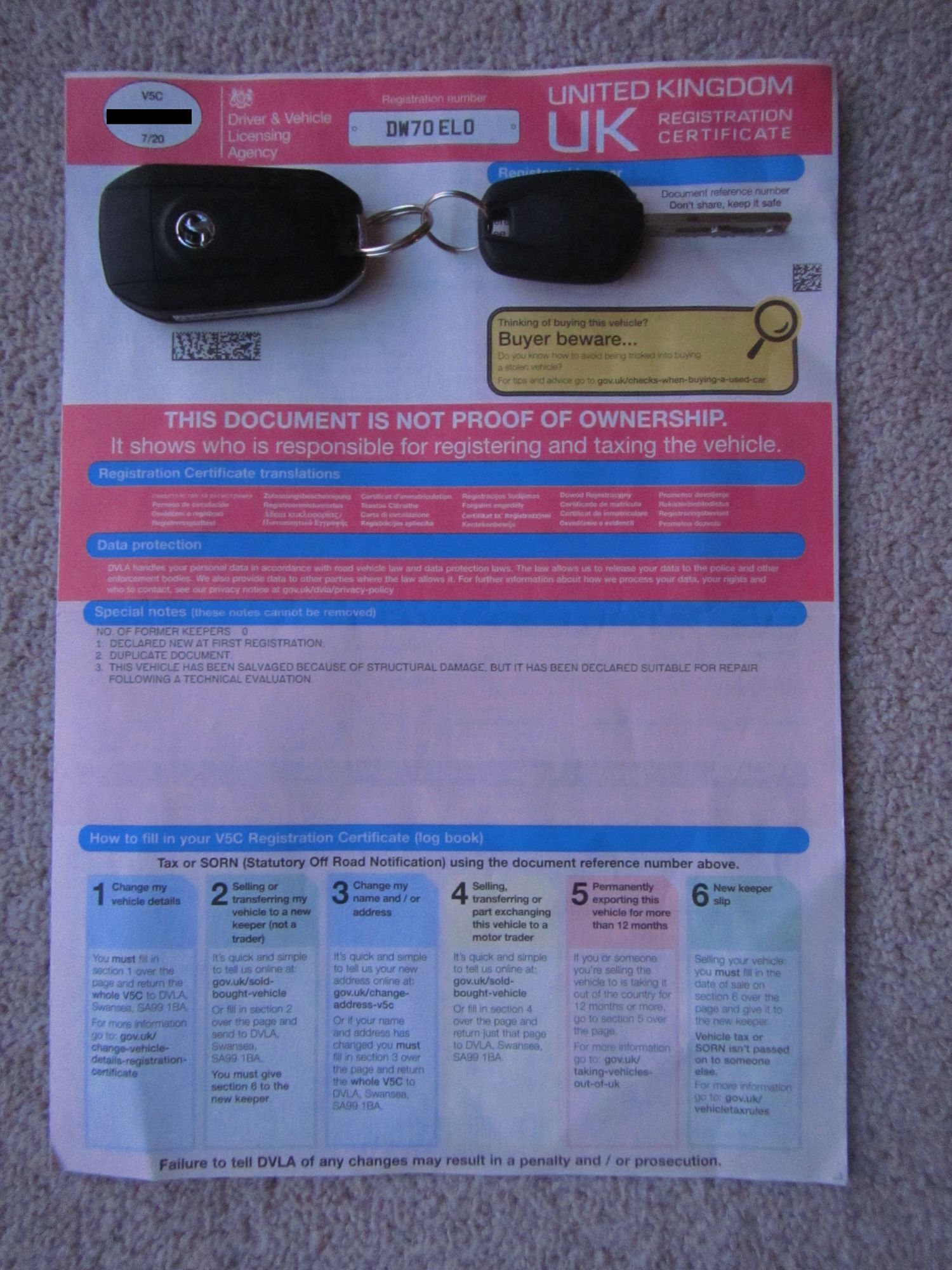We have 2 x keys and the V5 log book.
